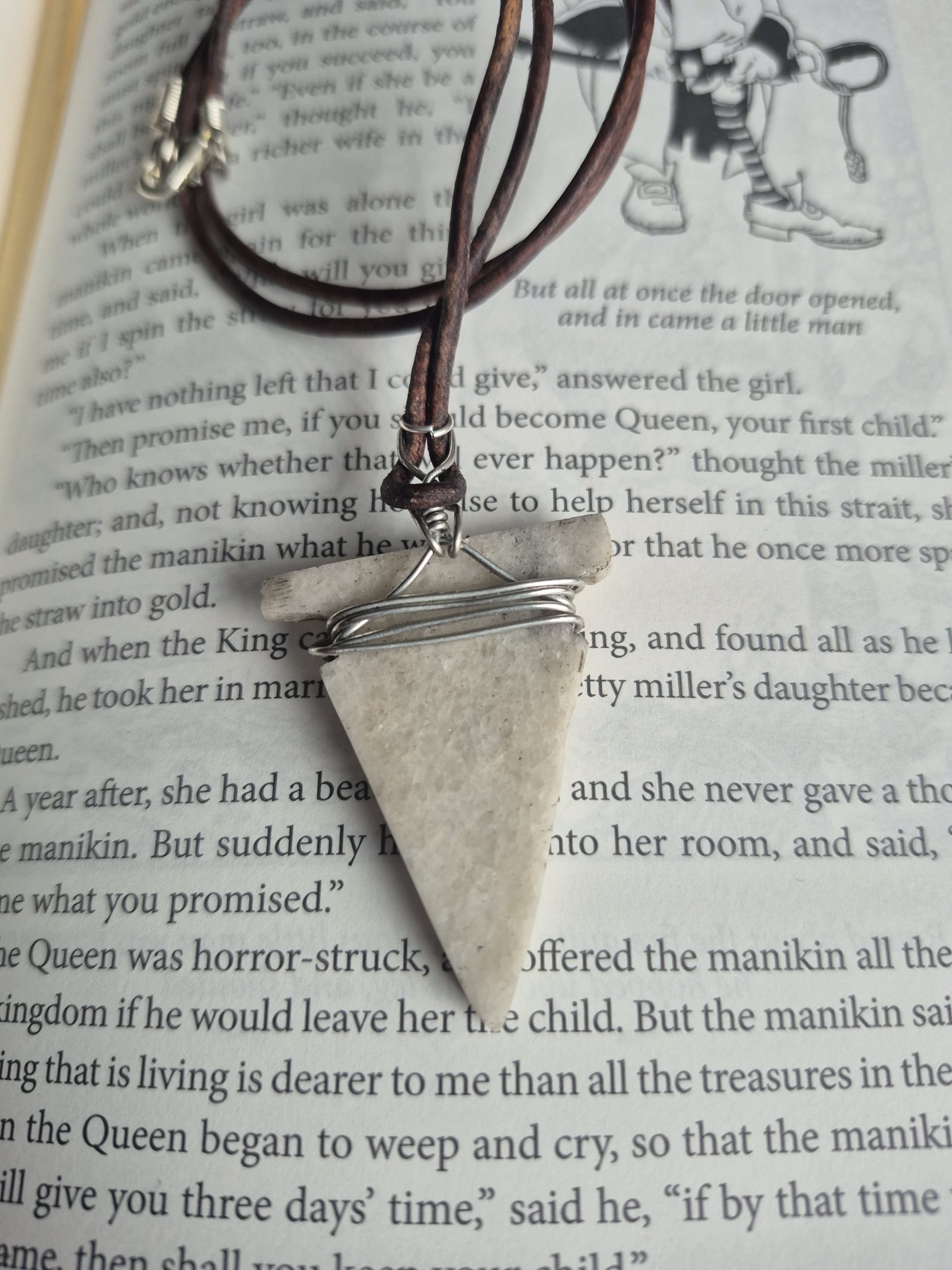 Handcrafted leather necklace with a cut and polished white stone arrowhead pendant.